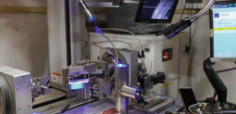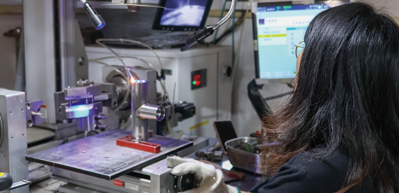 The bent and machined stainless steel parts are welded together to form the main body of the faucet