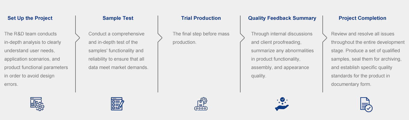 At the nascent stage of product development, we are committed to fundamentally ensuring the practical effectiveness and solid reliability of our products through meticulous design and deep insights into customer needs. Before mass production, we rigorously test every sample to identify and eliminate flaws in the design phase, ensuring products exceed customer expectations and set a strong foundation for successful production.